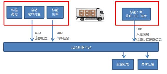 二,出發前,把測溫标簽粘貼在需要運輸物品的包裝上,在運輸車輛内安裝溫度監控系統,溫度監控系統按照設定的參數定時向标簽發送信号,讀取溫度數據並(bìng)可通過無線網絡把數據實時傳送到後台系統,管理人員可通過後台數據實時監控運輸過程的溫度變(biàn)化,並(bìng)可實現預警管理。此方案在有源和無源模式下均可實現。