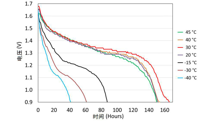 不同溫度下電(diàn)池連(lián)續放電(diàn)曲線: