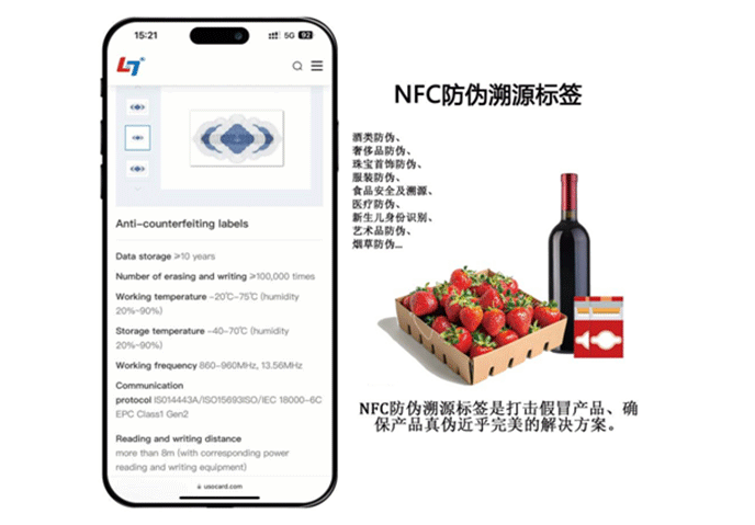 2. NFC防僞溯源标簽爲驗證産品真僞提供瞭可靠的解決方案。 通過使用智能手機或支持 NFC 的設備掃描标簽,消費者可以立即驗證産品是正品還是假冒産品,幫助他們做出明智的購買決定並保護自己免受欺詐産品的侵害。